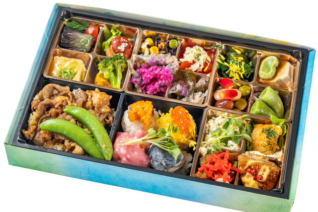 特製ステーキと割り下にこだわったすき焼きのボリューム満点のお弁当です。