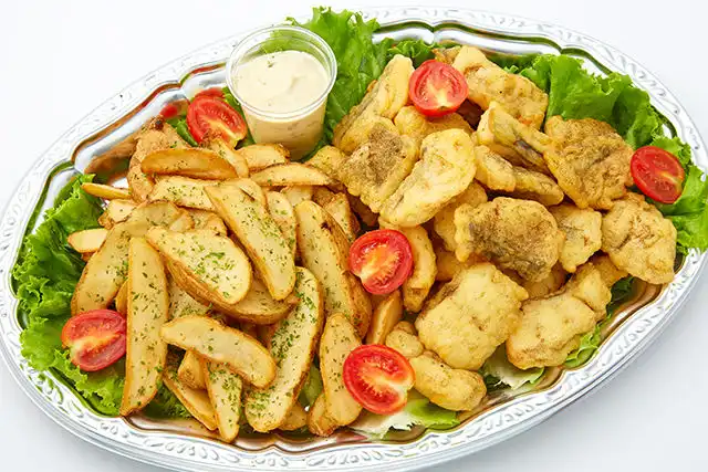 ポテトフライ、フィッシュフライ、ミニトマト、レタス、タルタルソース