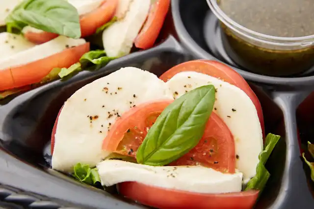 みずみずしいフレッシュトマトに、濃厚なモッツァレラチーズを乗せ、フレッシュバジルとブラックペッパーをあしらった、スパイシーで風味豊かなカプレーゼをお届けいたします。