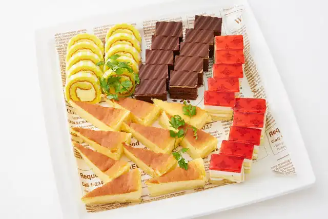 見た目もかわいらしいミニケーキを盛り合わせました。ホームパーティーのアクセントに、社内のお疲れさま会に、甘いスイーツはクセになります。