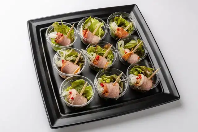 鴨ロースと、香ばしく甘みを引き出した焼きねぎを合わせた、和のテイストが光る贅沢なピンチョス。パーティーの一皿にふさわしい、洗練された味わいです。