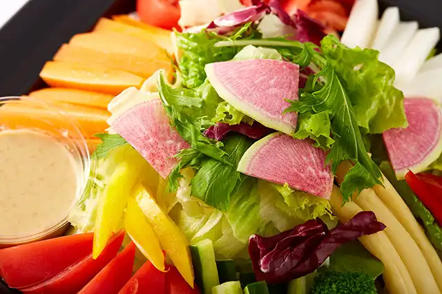 彩り豊かな野菜を、香りも豊かな胡麻ドレッシングと合わせてお楽しみいただけます。