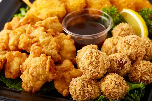 人気のフライ3種の盛り合わせをご用意いたしました。男性の多い集まりにはもってこいのひと皿です。