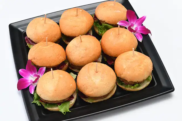 照り焼きバーガー、ハンバーグ、レタス、エディブルフラワー