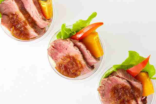 旨味に優れた発酵調味料、塩麹で仕込んだローストビーフに香ばしい焼き南瓜と鮮やかなパプリカを添えました。 じっくり煮込んだ玉ねぎを加えた醤油ベースの和風ソースとともにお召し上がりください。