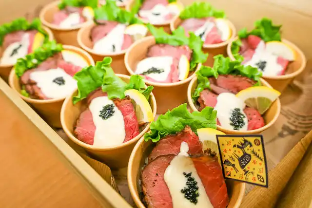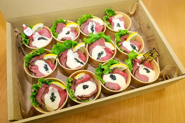 クリスマスならではの魅惑の組み合わせ、ローストビーフ&キャビアのmini丼です。ソースはクリスマス気分なホワイトマヨネーズソース。※画像はLサイズとなります。