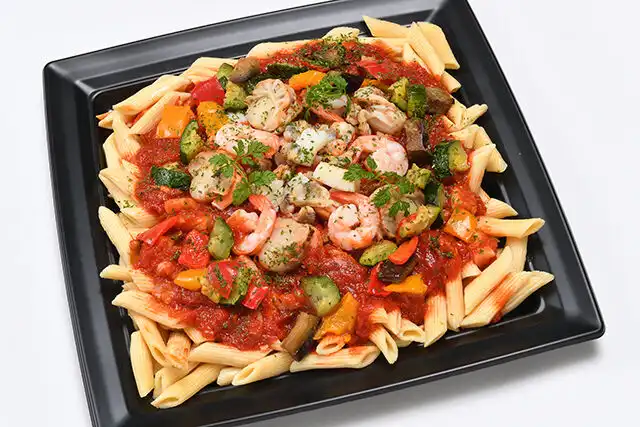 ペンネ、海老、ホタテ、いか、パプリカ、ズッキーニ