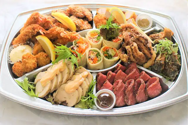 アルコール飲料との相性抜群、スパイスやハーブを効かせたお料理を中心に盛り合わせをお作りしました。当店自慢のビッグサイズの唐揚げは胡椒とレモンで旨辛味にアレンジ、しっとり柔らか鶏ハムには明太マヨソースをたっぷりかけました。オードブルの花形、ローストビーフも入った宴会に最適な一皿です。