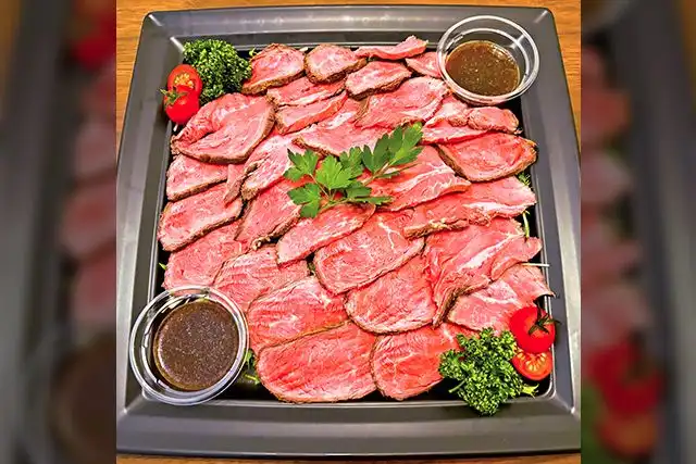 じっくりと低温で焼き上げた自家製のローストビーフにコク深いグレイビーソースを添えた一品。