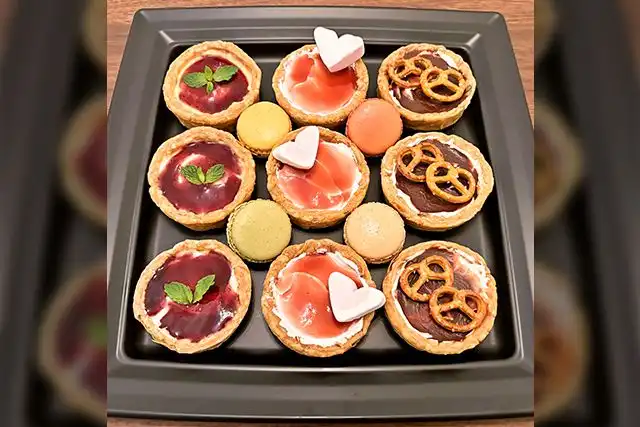ラズベリーソースのタルト、ブルーベリーソースのタルト、ダブルチョコレートのタルト、カラフルマカロン