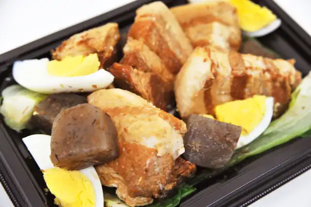 豚肉の角煮、こんにゃく、ゆでたまご、チンゲンザイ