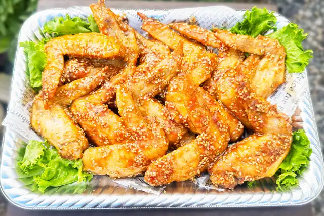 カリッと揚げた手羽先に、自家製焼肉のたれで作った甘辛たれをたっぷり!