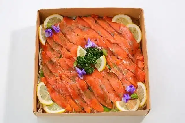 スモークしたサーモンスライスをバジルオイルソースをかけてカルパッチョ仕立てに。お肉系が多くなりがちなパーティー料理のメニューにアクセントを加えるお勧めの一品です。
