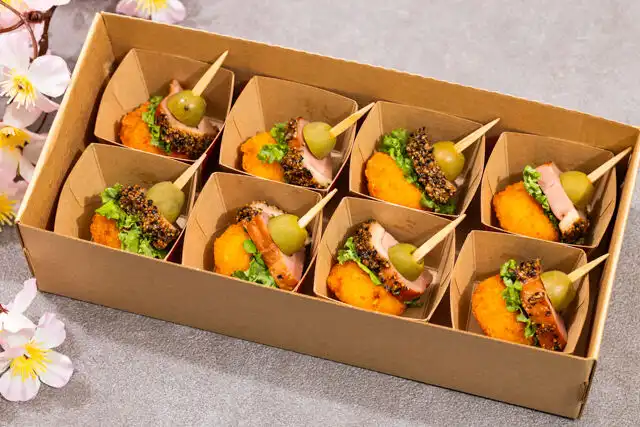 ジューシーな合鴨と濃厚チーズを組み合わせたフライのピンチョス。ひとくちで味わえる手軽さと、香ばしい衣の食感がアクセントになり、パーティーを華やかに彩る一品です。