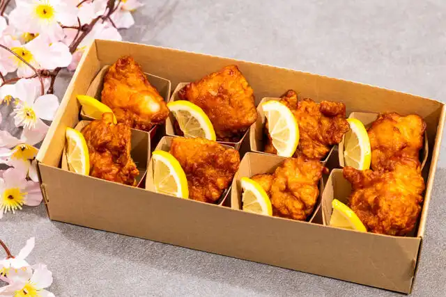 ジューシーで食べ応え抜群の国産鶏の大きな唐揚げ。外はカリッと香ばしく、中はふっくらジューシーで満足感たっぷり。手軽に楽しめるパーティー定番メニューです。
