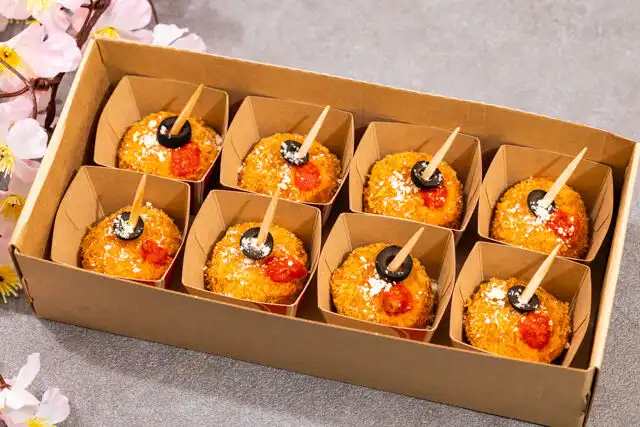 チーズの旨味を閉じ込めたリゾットをサクサクの衣で揚げたリゾットフライです。濃厚なチーズの風味と香ばしい食感が楽しめ、手軽に味わえる一口サイズ。立食パーティーや懇親会でも取りやすく、テーブルを彩る人気の一品です。