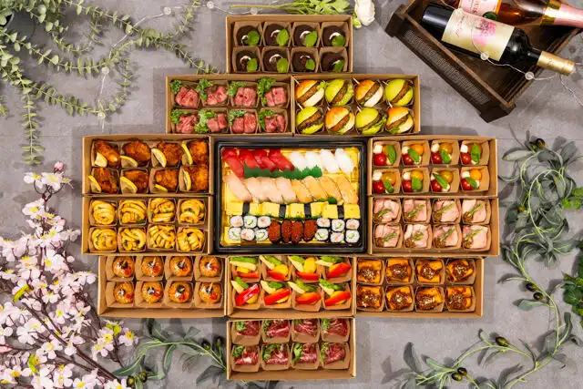 全品小分けの容器で取り分けもしやすく、衛生的で安心。色とりどりのお料理は目で楽しく、パーティを華やかに彩ります。