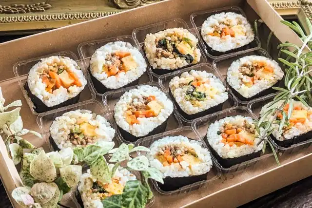 彩り豊かな具材をぎゅっと巻いたキンパ。ごま油の香りが食欲をそそる、小分けカップで手軽に楽しめる韓国風オードブルです。