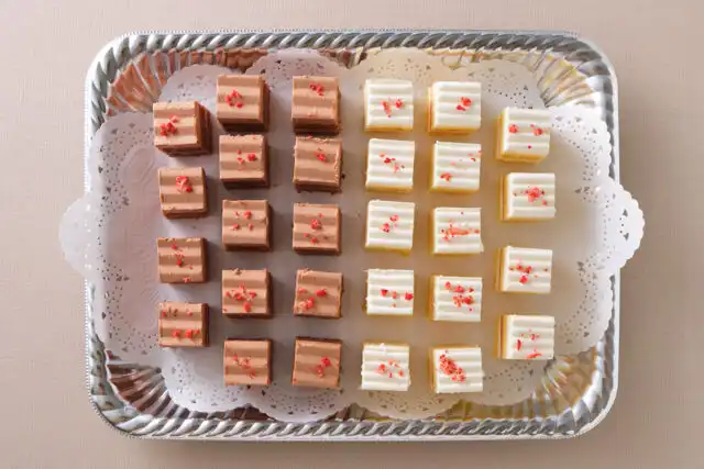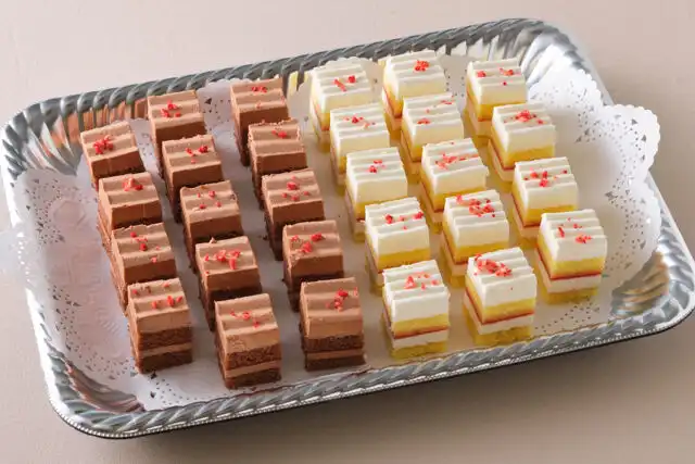 2色のプチケーキを盛り合わせにしました。パーティーを華やかに彩ります。