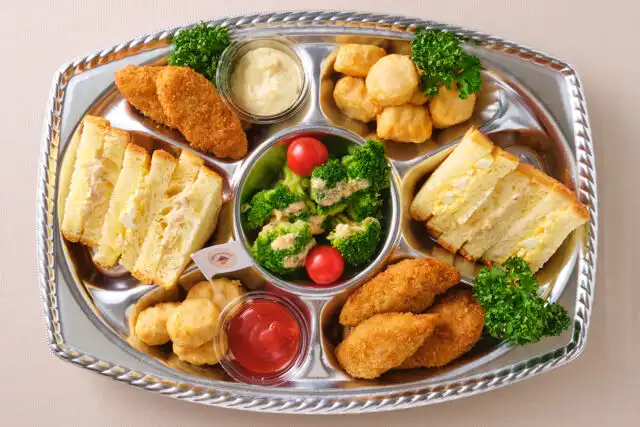 プチサラダ、チキンナゲット、フライドフィッシュ、こだわりデニッシュのミニサンド(たまご、ツナ)が楽しめる贅沢な盛り合わせです。約5人前を盛り込んでいます。