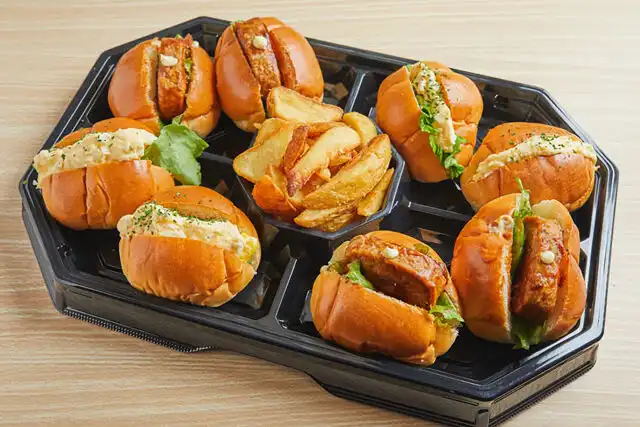 バターロール、ハンバーグ、玉子サラダ、レタス、フライドポテト