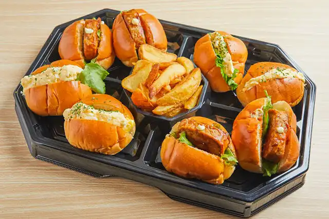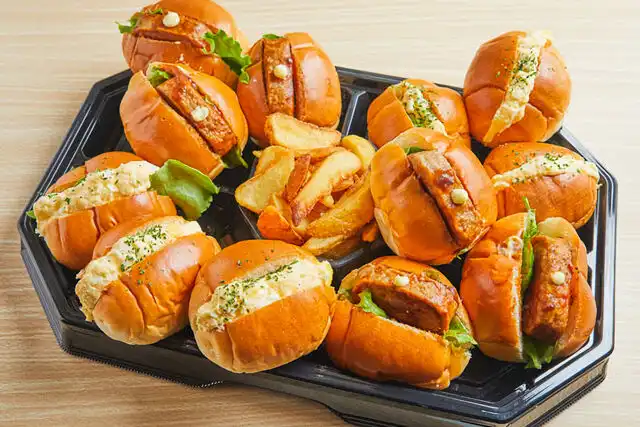 グランデリカの手作り玉子サラダとハンバーグのロールサンドです。早朝から夜遅くまでお届け可能!イベントやロケ、ちょっとしたパーティーまで幅広くお召し上がり頂けます。※1枚目の画像はMサイズです。