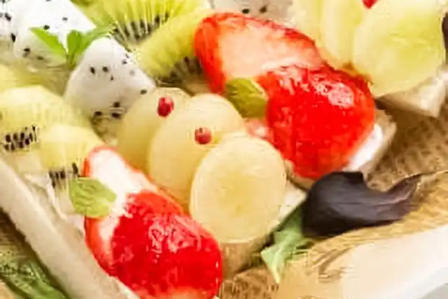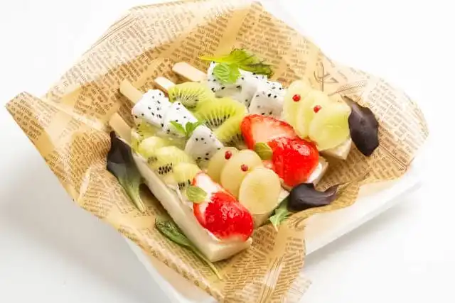 オープンフルーツサンドをお手軽に摘んでいただけるよう串に刺しました。華やかなビジュアルが場を彩ります。