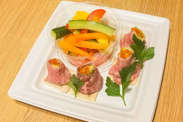 厳選ミスジ肉のローストビーフ(蔵王のクリームチーズ/アボカド/人参/とびっこ)/スティック野菜