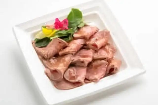 低温調理でじっくりと仕上げた厳選ミスジ肉ローストビーフに特製ソースをかけました。