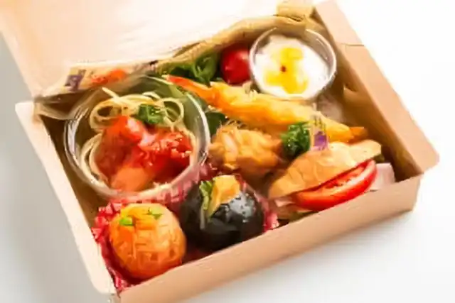手毬おにぎりチキンライス約50g/手毬おにぎり(天むす)約50g/エビフライ/とり唐/クロワッサンサンド(ハム、トマト、レタス)/ミートボール/ソーセージスパゲティートマトソース/ミニトマト/杏仁豆腐プチカップ/タルタルソース