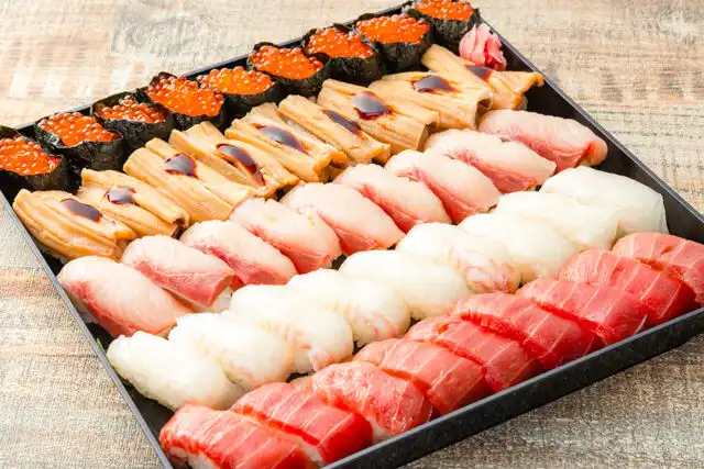 画像は「いくら、あなご、かんぱち、たい、まぐろ」ですが、お寿司のネタはお任せとなります。
