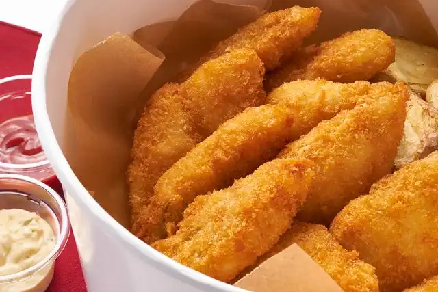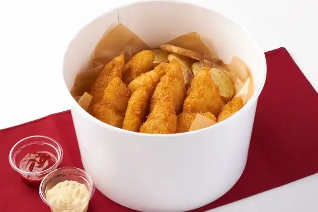 紐を引いて15分、出来立て熱々のフライドフィッシュとポテトをご自宅で楽しめます。人気のフライドフィッシュとほくほくポテトを一皿に。タルタルソースとケチャップでお楽しみください。