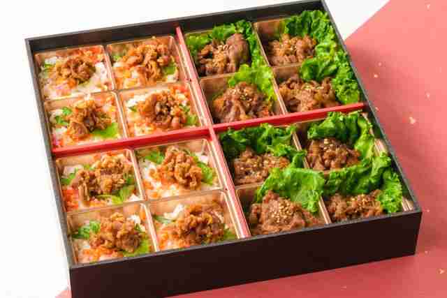 メインは、人形町今半の黒毛和牛の旨味が凝縮した「国産黒毛和牛の絶品焼肉」と、さわやかなちらしご飯と甘辛く仕立てたお肉の相性が抜群な「国産牛しぐれ煮の彩りちらし」。「国産黒毛和牛焼肉バーガー」や、和洋の彩りを添えるデリなど、どなたにも喜ばれる7種の味覚をバランス良く盛り込みました。