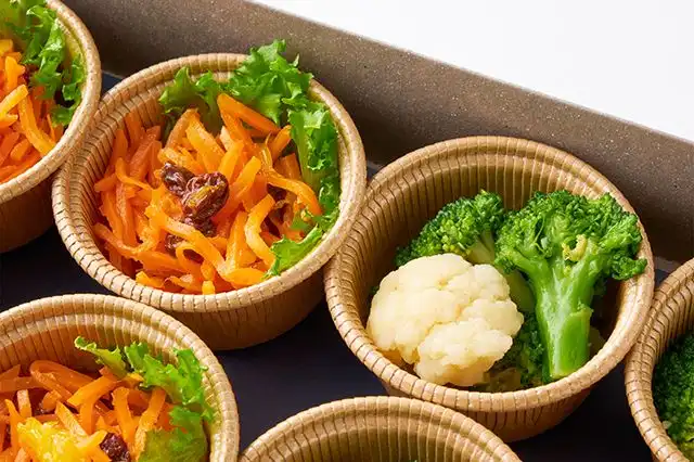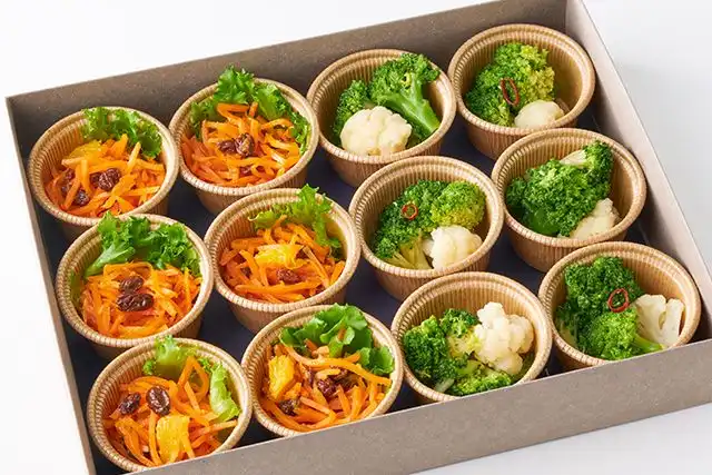 キャロットラペ、オレンジ、ブロッコリーのペペロンチーノ、グリーンリーフ、カリフラワー