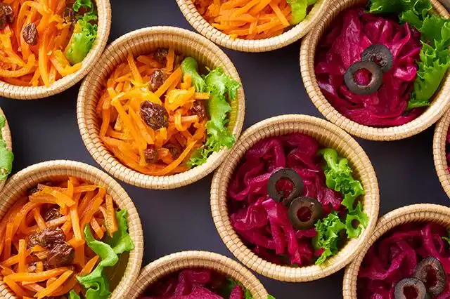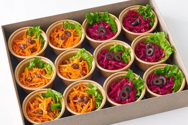 紫キャベツの酢漬け、黒オリーブ、グリーンリーフ、キャロットラペ、カリフラワー