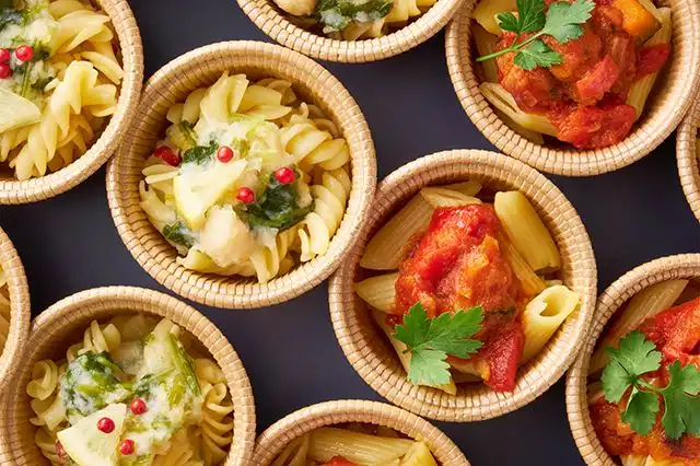 パスタ(フジッリ)、貝柱のペペロンチーノソース、レモン、ピンクペッパー、パスタ(ペンネ)、オルトラーナソース、チャービル