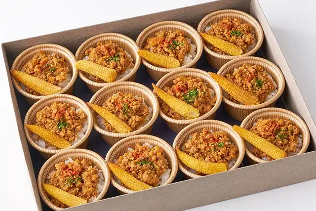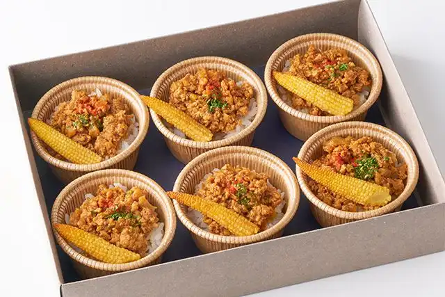 ご飯、肉味噌、ヤングコーン、パセリ、パプリカパウダー