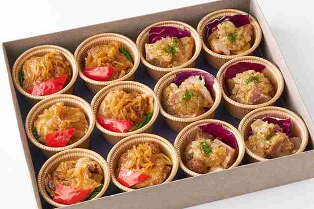 Lサイズ(1皿に12カップ)のお料理を8品でお届けいたします。12名様程度でお召し上がりになると丁度よい量です。