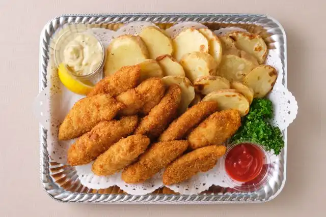 人気のフライドフィッシュとほくほくポテトを一皿に。タルタルソースとケチャップでお楽しみください。