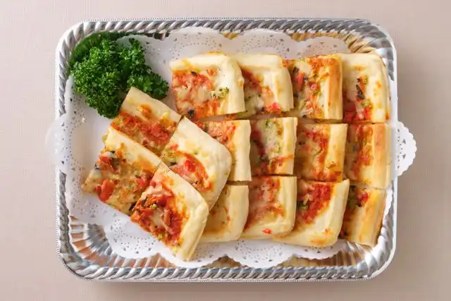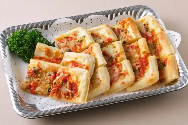 サクッとした食感の一口ピザ。ブロッコリー、ブラックオリーブなどトッピングを乗せました。
