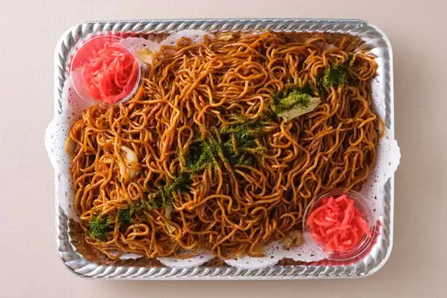 これぞ屋台の味!ソースの香ばしさがたまらないソース焼きそばです。紅生姜を添えて。