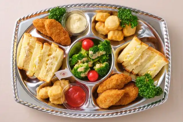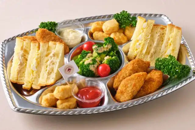 プチサラダ、チキンナゲット、フライドフィッシュ、こだわりデニッシュのミニサンド(たまご、ツナ)が楽しめる贅沢な盛り合わせです。約5人前を盛り込んでいます。