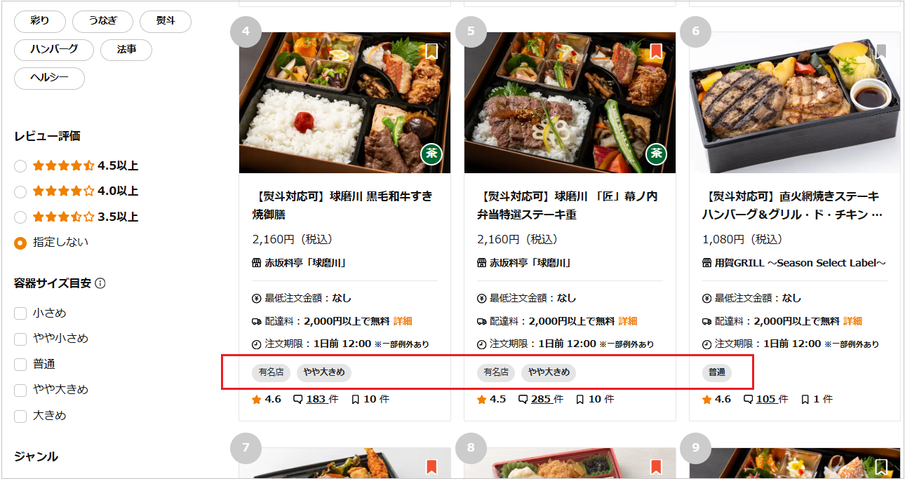 検索結果に表示されるお弁当の一覧にも、容器サイズ目安が表示されるようになりました。 商品ページを開かなくても、並んでいる商品を容器サイズ目安で比較できるため、お弁当選びがよりスピーディーになります。