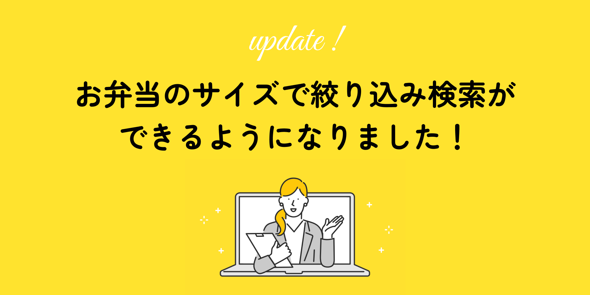 商品検索画面(およびTOPページの検索窓)の絞り込み条件に、新しく「容器サイズ目安」が加わりました。 5段階のサイズから、用途に合わせてお弁当を絞り込むことができます。「小さめ」から「大きめ」まで、複数を組み合わせて検索することも可能です。