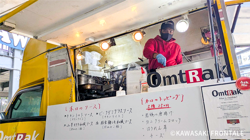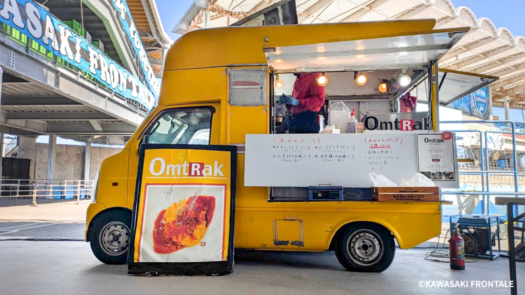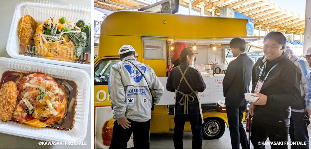 Uvanceとどろきスタジアム by Fujitsuでの試合開催時に約800食規模のスタッフ弁当を提供しています。この度の新しい取り組みでは、キッチンカー提供の第1歩として、まずはクラブスタッフを対象とした試合運営に関わるスタッフへ温かい食事を提供。第1弾は人気オムライス店「OmtRak」にて、4種類のソースから選べる特製オムライスを提供しました。