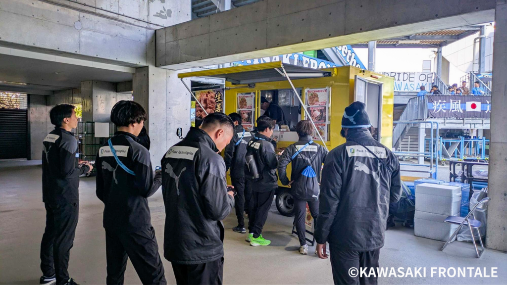 スポーツ興行の成功には、選手たちの活躍だけでなく、多くのスタッフによる支援が不可欠です。川崎フロンターレでは、試合運営に関わるスタッフの皆さんへの新たな食事提供の取り組みをスタート。これまでのスタッフ弁当を一新し、キッチンカーによる”温かい食事”の提供を実現しました。