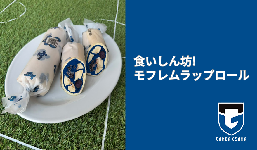 一方、ガンバ大阪からは「食いしん坊! モフレムラップロール」という、ユニークなスイーツメニューをご用意しちゃいました。ガンバ大阪の公式マスコット・モフレムがおやつに選んだというテーマのこの商品は、モフレムのふわふわボディをイメージした青色クリームが目を引く、見た目も楽しいサプライズ。