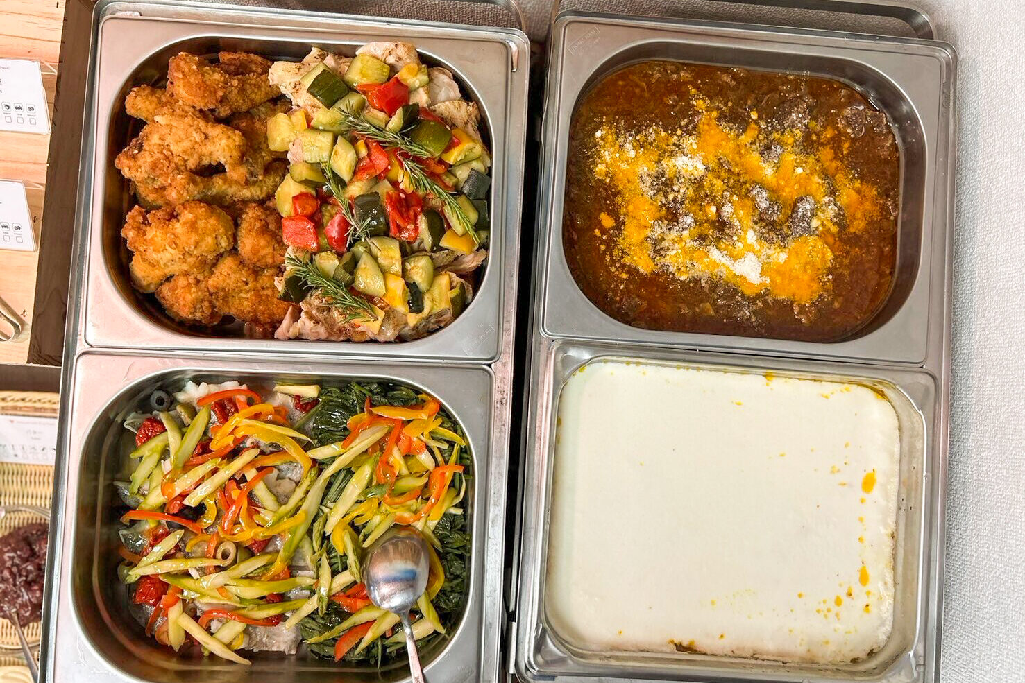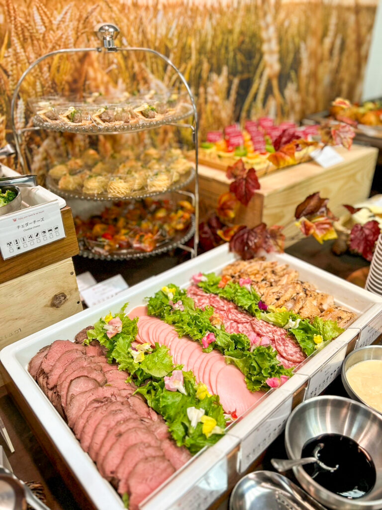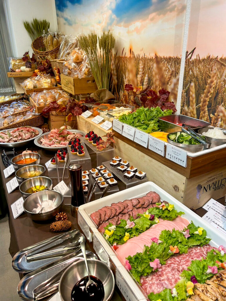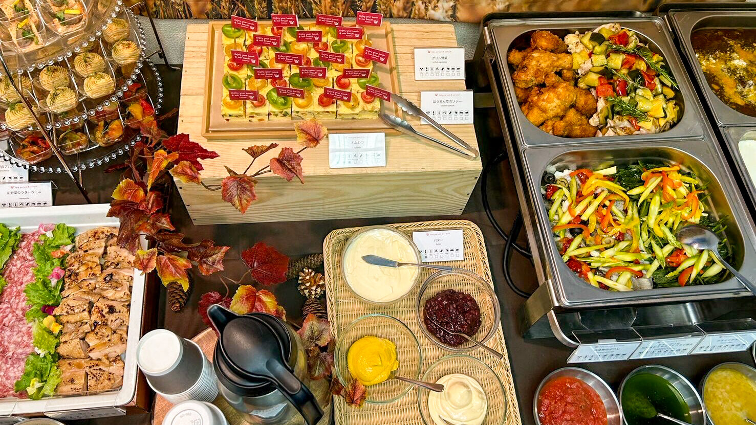温製料理には、チキングリル(北海道とうやポテトフライ添え、3種ソース)、白身魚のポワレ、国産牛肉の赤ワイン煮込みなどを提供。冷製料理では、カラフルトマトのキューブオムレツ、彩野菜のラタトゥイユ、鹿肉のレモンリエットなどをご用意しました。