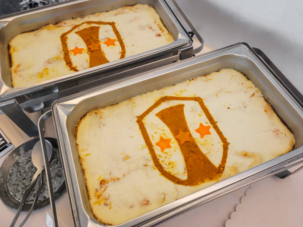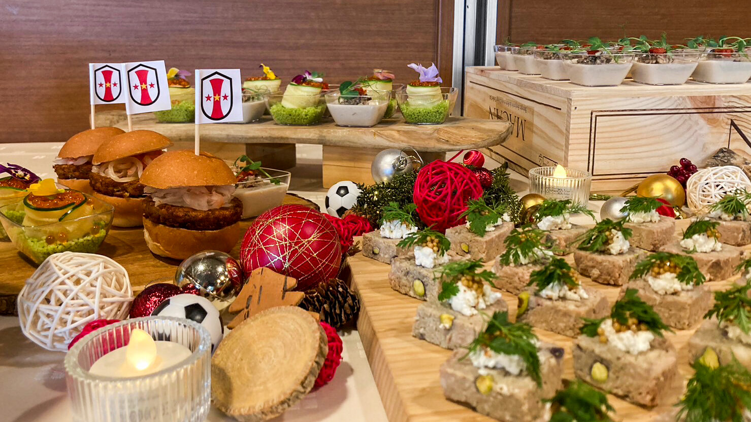 VIPルームケータリングでは、特別なゲストに最高のおもてなしを提供するため、魅力的なシグネチャーメニューを揃えています。特に人気だったのが、チームロゴをあしらったグラタンです。このグラタンは、チームカラーとロゴが美しく表現され、視覚と味覚の両方で楽しめる逸品です。 また、持ち運びしやすいカップ料理やフィンガーフードも多くのゲストに喜ばれています。試合を観戦しながら気軽に楽しめるため、VIPルームでの食事に最適です。 さらに、ロゴ入りフラッグを使用したハンバーガーも好評でした。このハンバーガーは、見た目も楽しく、試合の盛り上がりを一層引き立てました。