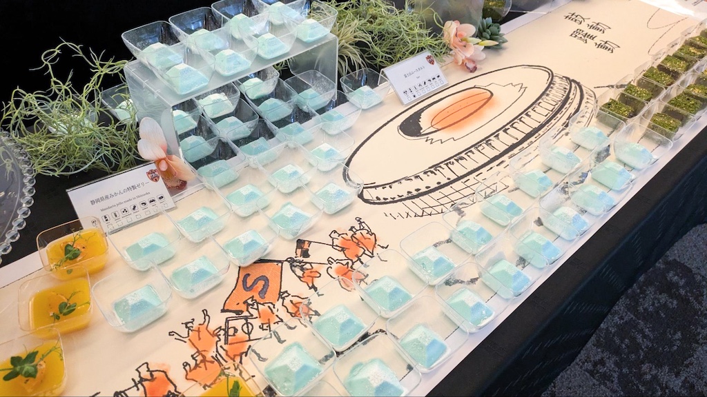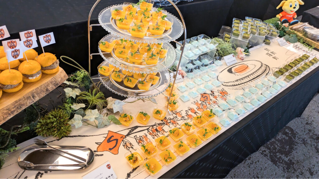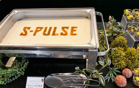 LIVE以外のビュッフェメニューも地元食材である、静岡県産鰹節、桜えび、みかん、わさび、茶葉などを取り入れ、チームロゴ入りグラタン、特製ゼリー、富士山ムースタルトなど静岡と清水エスパルスオリジナルを感じていただけるメニューでご提供しました。ロゴフラッグ付きミニバーガーは、エスパルスカラーの特注バンズを。カラー演出にもこだわりを加えました。
